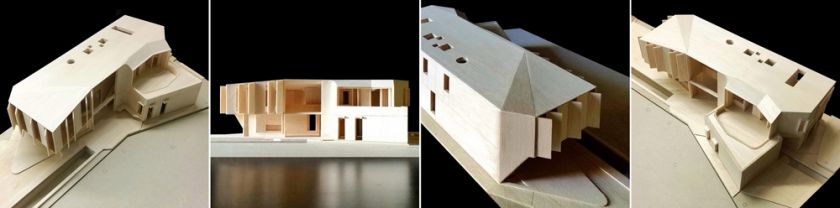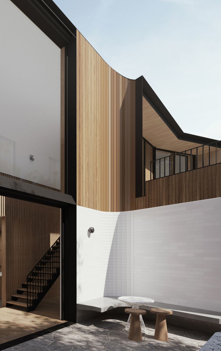 Externally, it incorporates white brickwork, blackbutt timber boards of varying width arrangements, black fine steel elements and expansive aluminium framed glazing for strong connections to outdoor spaces and its setting. A layering of dark bronze expanded mesh pivoting screens enable activation and engagement of the rear composition along the riverbank, temper shifting direct light to the rear upper floor, and modulate privacy to balcony & living spaces from an immediate neighbour and riverside walkers & cyclists alike.