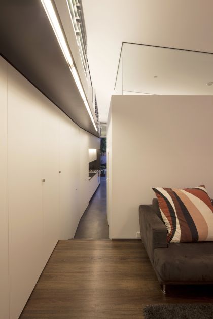 2. The retention of the original front dwelling and existing bathroom enabled old and new fabric to stitch an alternating sequence of compression and expansion, enfolding a series of rooms from the narrow hall and front cellular 3-room layout, to open release in a new Living room, followed by a compressed scale shift and downward level change into the heightened rear openness of a Dining, Kitchen and second Living space.